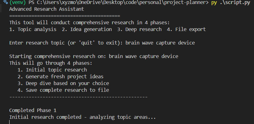 This is a little tool I put together to help with researching and planning projects. It's especially handy if you're into computer stuff and need ideas or detailed plans for your next big thing. It uses a simple command-line interface to ask you what kind of project you're interested in, and then it gives you a detailed plan, including the tech stack, features, and even some code snippets to get you started.